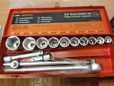 Набор головок с трещоткой, 3/4", 22 -50 мм, 14 предметов Головки торцевые — 22, 24, 27, 30, 32, 36, 38, 41, 46, 50 мм.