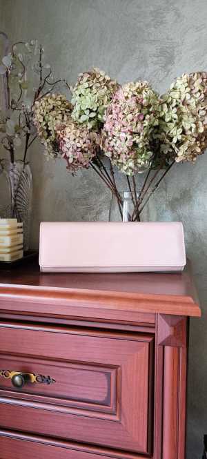 Оригинальный глянцевый клатч из искусственной лаковой кожи нежного пастельно-розового цвета, цвет на фото не передаётся...