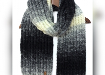 Шарф Омбре связан из пряжи объёмной, с плавными переходами и классической гаммой цветов чёрный, серый и сливочный.
