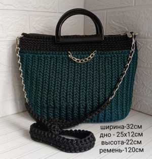 Очень красивая вязанная сумка, из полиэфирного шнура, дно кожзам, ручки металлические. Подкладка и два кармана.