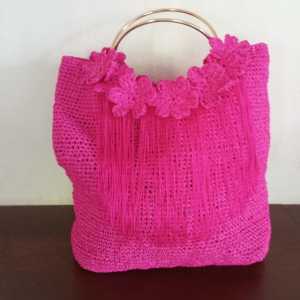 Яркая летняя сумка из рафии ,цвет фуксия. Украшена вязаными цветами и бахромой. Ручки металлические,под золото.