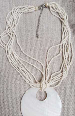 Бусы из бисера (8 нитей) с перламутровой подвеской. Длина без подвески 44 см. Диаметр подвески 7 см. Новые.