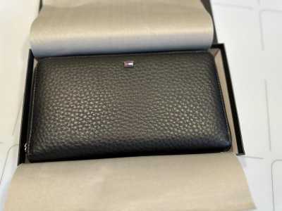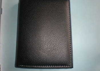 Упаковочной плёнки на коробке нет. Кошельком не пользовались. Внешне - кожаный, чёрный.