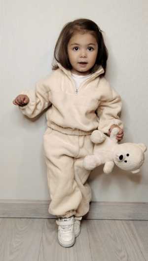 Теплые флисовые костюмы размер 100 . На 3 годика . Цвет беж и молочный . Спущенный рукав , модель Оверсайз .
