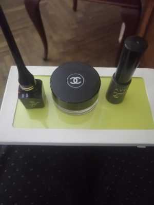 Шанель тени запечённые, серебристо сиреневый цвет, подводка черная и и черные тени рассыпчатые.