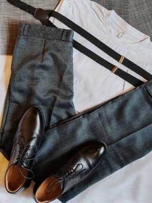 Классические темно серые мужские брюки со стрелками с двумя карманами спереди и одним сзади.