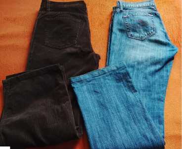 1. Тёмные (разм 32) БУ условно - дня 3-4 носки -даже не обрезаны + см. состояние ткани - потёртостей нет. Материал тянущийся.
