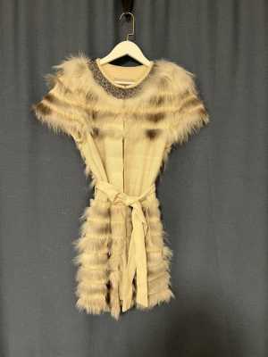 Шерстяной кардиган с поясом, с нашитым мехом лисы. Длина 88 см, ширина 49 см. Рукава укороченные. Ворот отделан бисером.