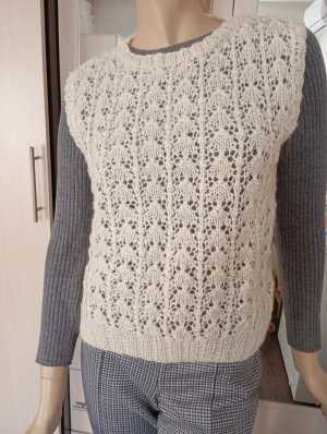 Жилет связан из мохеровой пряжи молочного цвета с очаровательными ажурными мотивами.