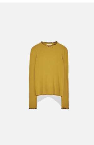 Горчично-желтый топ Zara с длинными рукавами и черной отделкой.
