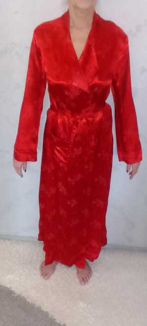 Двубортный на пуговицах женский шелковый халат насыщенного рубинового цвета с поясом. Размер 46-48, рост 170-175.