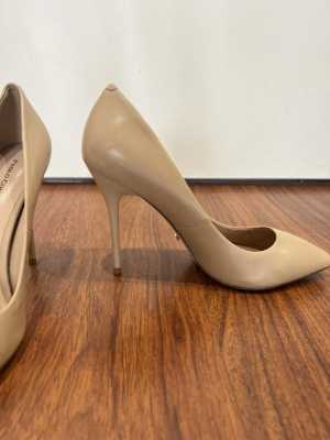 Бежевые туфли лодочки на тонком каблуке высотой 6см, с острым носом.Б/У