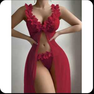 Пеньюар с новогодней тематикой, красного цвета. Верх сорочки кружевной, украшен белыми перьями, низ сорочки из плотной ткани.