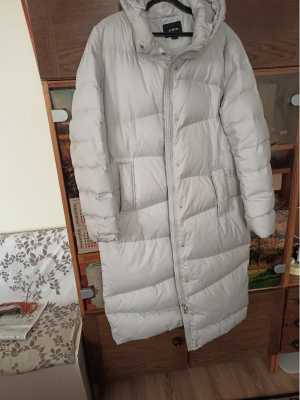 пуховик женский с капюшоном 46-48 размер светло-серого цвета застежка на молнии и кнопки. длина 110 см и ширина 56.