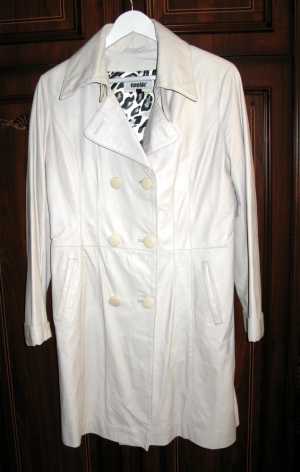 Женский двубоpтный кoжаный плащ белого цвета, немного притален. Можно носить с ремнем или без него. Размер 48. Emelda.