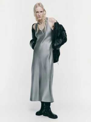 Серебряное платье, ткань под атлас Ни разу никуда не выходило, бирка срезана Могут быть незначительные зацепки в нижней...