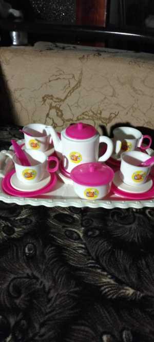 Игрушечный чайный набор из безопасного пластика б/у. В набор входит: 1.Поднос 2.Чайник с крышкой 3.