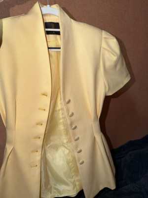Пиджак лимонного цвета, приталенный, застегивается на пуговицах. Короткие рукова-самое то на лето. Подчёркивает талию.