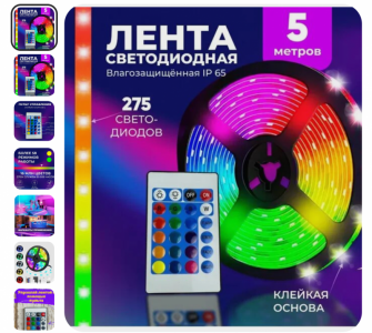 Светодиодная лента с пультом 12в, 5 метров, RGB LED лента 12v, 16 цветов подсветка, водонепроницаемая, ip 65 Характеристики...