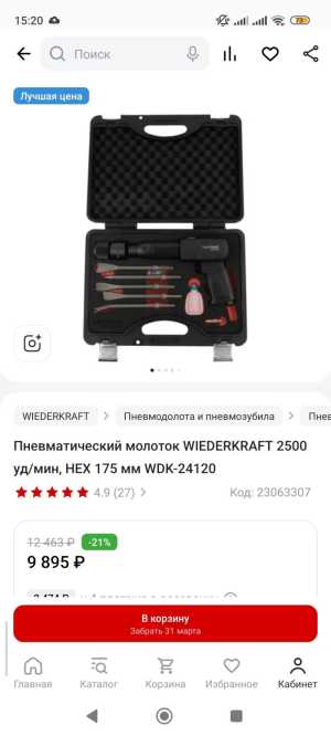 Пневматический молоток WIEDERKRAFT 2500 уд/мин, HEX 175 мм WDK-24120