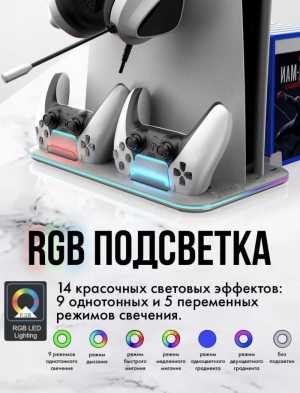 Подставка с охлаждением вертикальная для PS5 Slim & Fat с подсветкой крючком для гарнитуры и зарядными станциями для 2х...