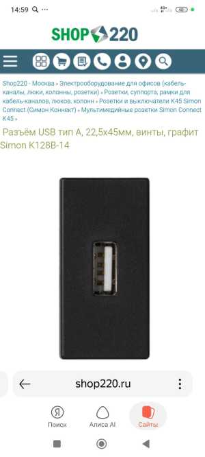 Плата с разъемом. USB 2.0. 22.5 x 45 mm. винт.зажим графит Connect SIMON K128 B-14