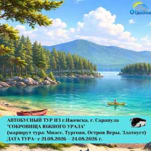 Описание День 1 21.08.2026 19: 45 –отправление из г. Ижевск (21.08.2026) 20 : 45 –отправление из г. Сарапул День 2 г.