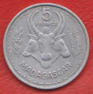 Мадагаскар Французский 5 франков 1953 г. Состояние на сканах и фото.