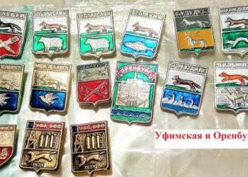Продам набор значков Гербы городов Уфимской и Оренбургской губернии, геральдика, выпущены в СССР.