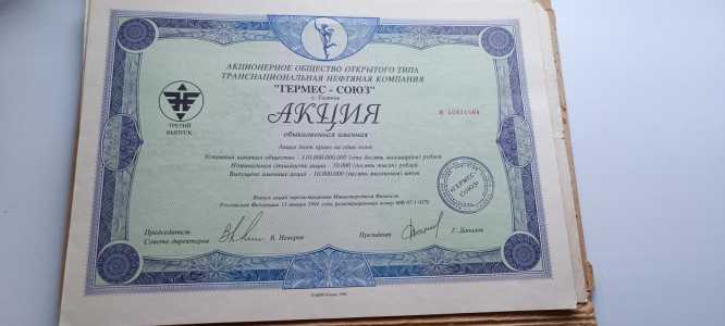 Акции 10 штук одним номиналом как на фото. Есть именной подтверждающий документ. Цена за одну штуку.