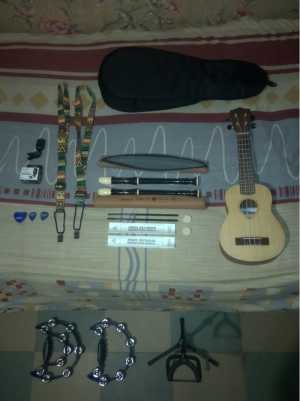 Укулеле сопрано, 2 блокфлейты, 2 тамбурина, стойка, чехол, ремни, тюнер с батарейкой, медиаторы, копилка для медиаторов...