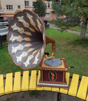 Граммофон с большой деревянной трубой. Реставрация. Поверхность корпуса изготовлена в произвольном стиле.