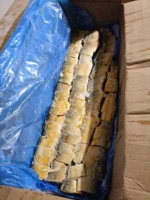 Замороженные в брикетах кусочки, Масса брикета 7 кг, в ящике 4 брикета. Масса каждого кусочка 60…80 г, Они копчёные