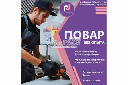 Сфера деятельности: Туризм, гостиницы, рестораны; Специализация: Повар; Опыт работы: Нет опыта; Тип занятости: Полная занятость; График работы: Гибкий график; Вид организации: Работодатель;