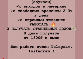 Работа только удаленно через интернет и занимает два часа в день. Опыт не требуется. Обучаю всему с нуля.