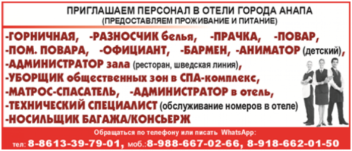 Анапа. В отель требуется персонал на сезонную работу (июнь-сентябрь).