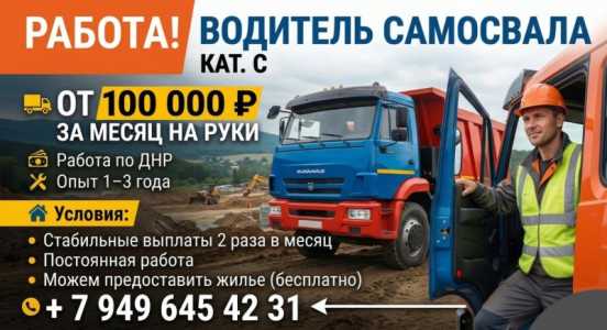Водитель самосвала от 100 000 ₽ за месяц на руки Полная занятость Обязанности: Работа на свежем самосвале, Проверка...