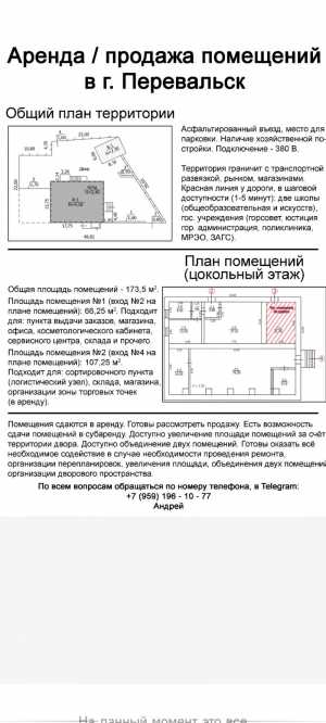 Состоит из помещения 90м2, 4 подсобных помещения, газовая котельная, туалет, хоз.