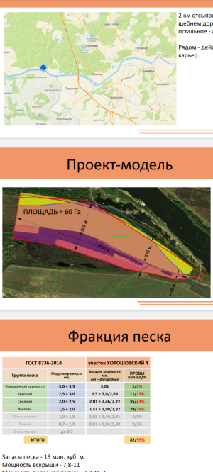 Песчаный, фракция 2-3. Не вскрытый. 10 км. от Каширы. 13 млн куб.м. песка. Участок 60 га в собственности.