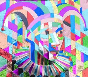 Панно "Шут в кубе" изготовлено в новаторской технике с использованием металлопластики и цветного золочения.