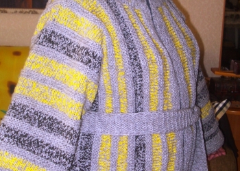 Пальто вязаное спицами, начиная с рукава. Вертикальные полосы придадут стройности. Застежка на молнию.