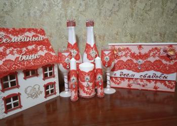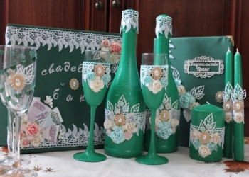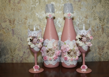 Представляю свадебное шампанское, украшенное тканевыми цветами, стразами, атласными лентами.