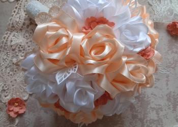 Букет изготовлен из атласных лент с добавлением кружева, страз. Диаметр букета примерно 20-22 см.