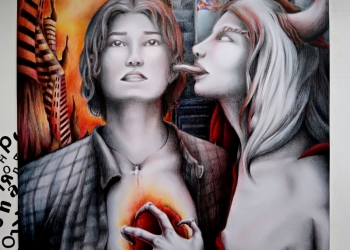 А3 формат (30*40 см). Цветные акварельные карандаши, уголь, механический карандаш. Во власти суккуба.