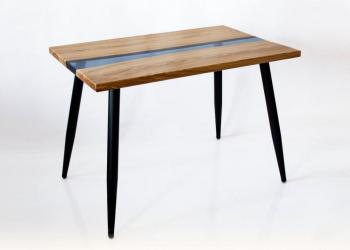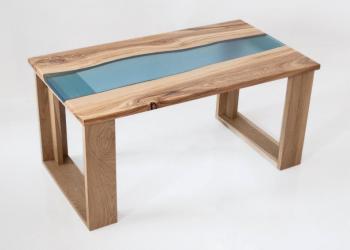 Журнальный стол из массива, цвет тонировки древесины темный. светлый.Прозрачно-голубая река из эпоксидной смолы.Размер 90*50.