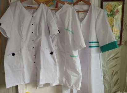Медицинские халаты в ассортименте: 1.Фото 2-4 - халат на кнопках с коротким рукавом.