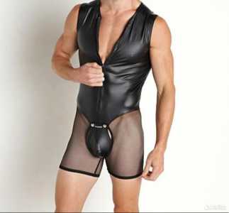 Мужской эротический комбинезон черного цвета, с доступом спереди. Материал верха спандекс, шортики сетка.