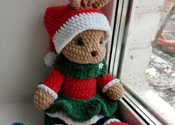 Новогодняя Зайка связана из плюшевой пряжи. Наполнитель: синтепон. Глазки и носик на безопасном креплении. Рост: 36 см.