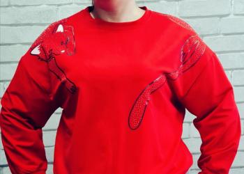 Новая кофточка ярко красного цвета с мордочкой и хвостиком лисы со стразами.