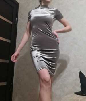 Новенькое облегающее платье из велюра серебристого цвета. Ткань хорошо тянется, так что можно считать его безразмерным.